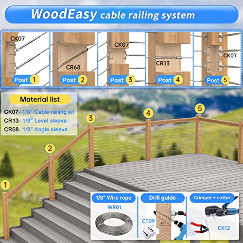 预设计的系统 - 我们预先设计了一个WoodEasy缆索栏杆系统,以帮助您构建一个适用于初学者的木制系统。它包括1/8英寸的压接式调节杆、水平和倾斜的保护套(CR13-水平,CR68-30°)、1/8英寸的钢丝绳WR01、液压卡压工具和钢丝绳剪刀CK12、钻孔导向器CT09。请注意,套装中仅包含第1条项目中列出的内容,其他提到的内容不包括在内。